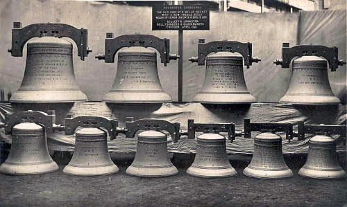 The inscriptions on the bells are detailed below. There was some question over the inscription on the 3rd and for a while it was presumed that the inscription to the USS Pittsburgh on the reverse of the 3rd bell was there in error. However, diligent research by J Martin Rushton, a former member of the band, revealed the link between the bell and the USS Pittsburgh. More details of this can be found in the section The Current Bells.