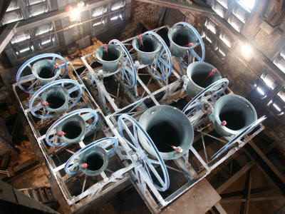 The current ring of bells were recast and augmented to ten by Gillett & Johnston, Croydon, in 1921. They were rehung in a steel frame by John Taylor and Company (Bellfounders) Ltd., Loughborough, in 1960.